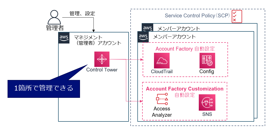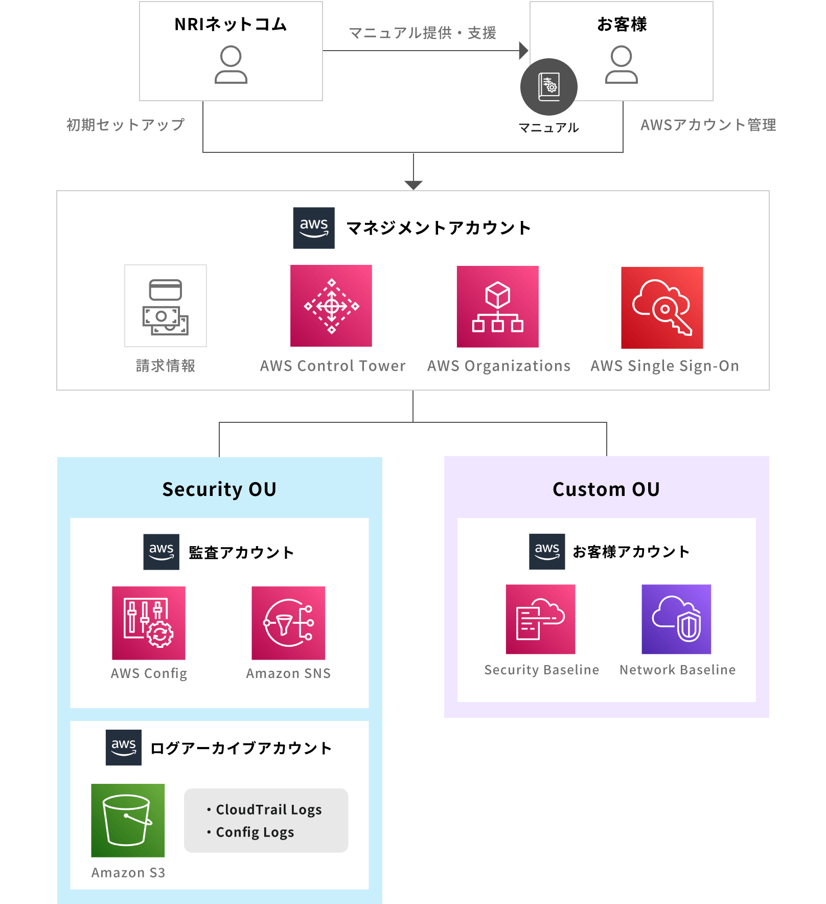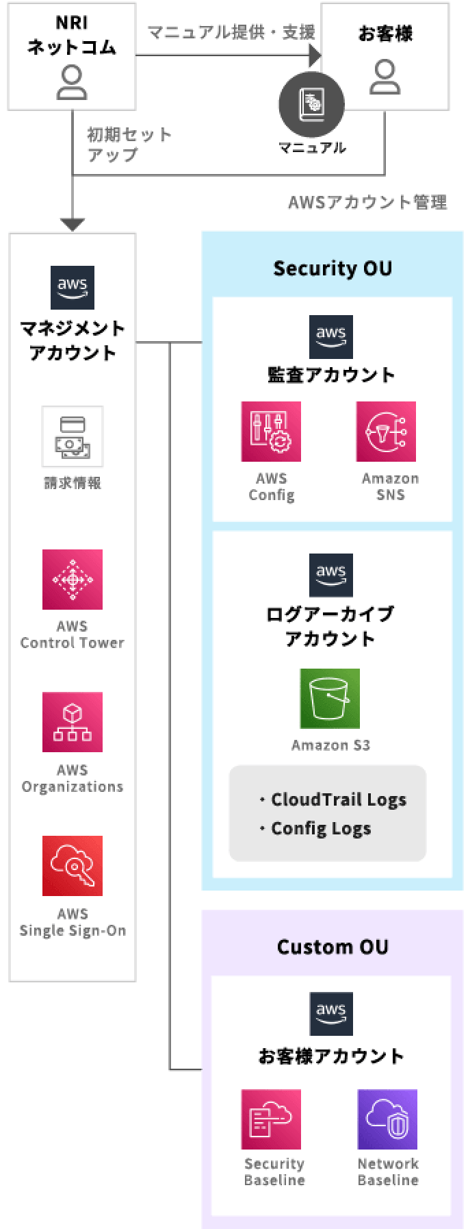 簡単に複数のAWSアカウントの管理ができるAWS Control Towerを活用し、お客様のAWSアカウントを簡単・安全に管理できるよう支援する サービスです。