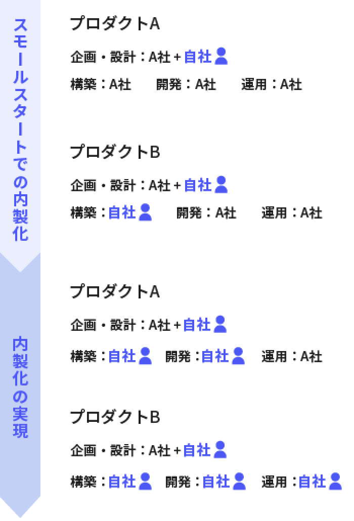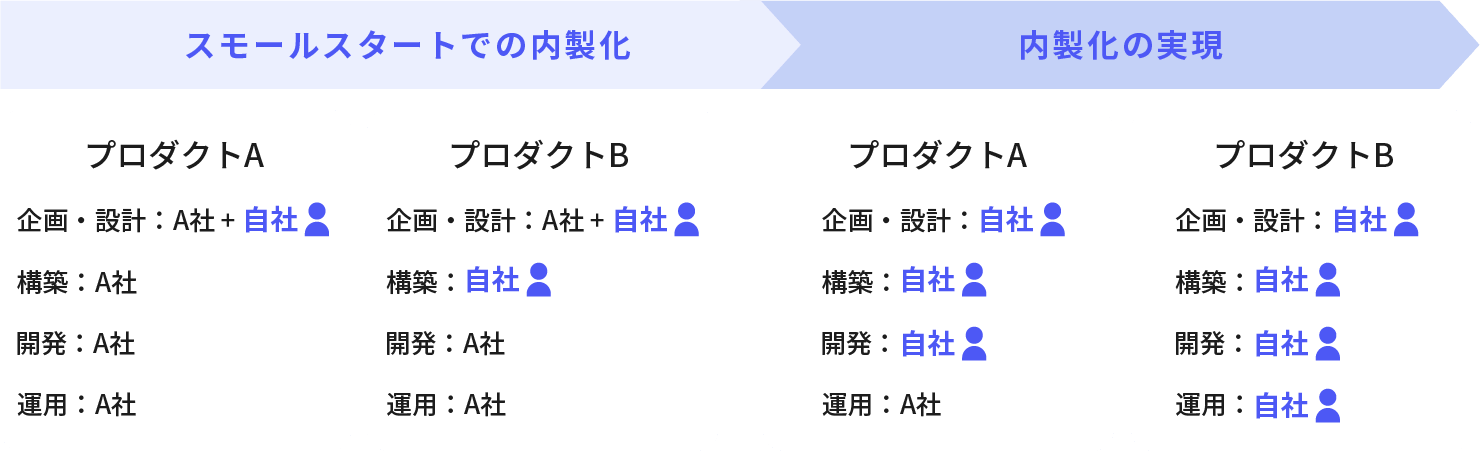 「新規プロダクトの基盤構築だけで内製化を実施してみる」「既存システムの運用の一部から見直してみる」など、小さな挑戦から徐々に内製化範囲を広げる「スモールスタート」も有効です。